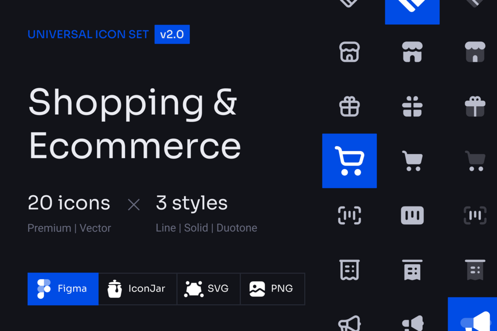 20 Shopping and Ecommerce Icons in 3 styles (Line, Solid, Duotone)
